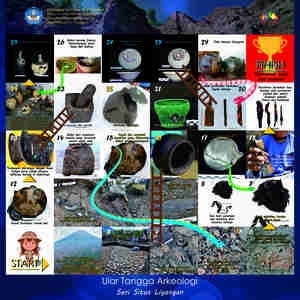 Desain permainan ular tangga dengan tema arkeologi Situs Liyangan. Dapat dicetak dalam ukuran boardgame atau ukuran besar.