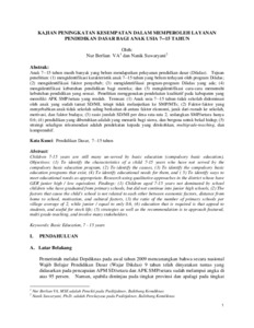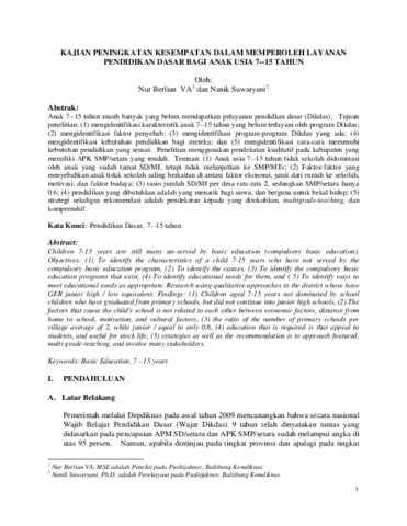 Berlian, Nur and Suwaryani, Nanik Kajian peningkatan kesempatan dalam memperoleh layanan pendidikan dasar bagi anak usia 7-15 tahun. Kajian Peningkatan Kesempatan Dalam Memperoleh Layanan Pendidikan Dasar Bagi Anak Usia 7-15 Tahun. pp. 1-16.