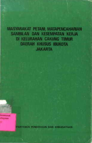 Penelitian tentang Masyarakat Petani. Mata pencaharian Sambilan dan Kesempatan Kerja dilakukan pada Kelurahan Cakung Timur. Kecamatan Cakung, Kotamadya Jakarta Timur. Kelurahan yang masyarakatnya majemuk ini terletak di pinggiran kota. tepatnya di wilayah DKI Jakarta bagian Timur Laut, berbatasan dengan wilayah Propinsi Jawa Barat.