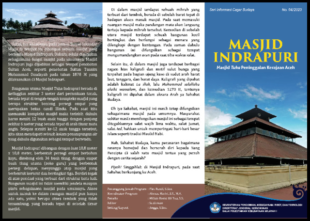Roma Uli Tua, Miftah (2023) Leaflet Masjid Indrapuri; Masjid Tuha Peninggalan Kerajaan Aceh (Seri Informasi Cagar Budaya) No.04/2023. Balai Pelestarian Kebudayaan Wilayah I, Aceh.