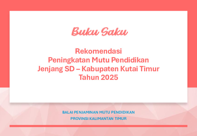 Balai Penjaminan Mutu Pendidikan Prov. Kalimantan Timur, BPMP Prov. Kalimantan Timur (2025) Rekomendasi peningkatan mutu pendidikan jenjang SD–Kabupaten Kutai Timur Tahun 2025. In: Rekomendasi peningkatan mutu pendidikan jenjang SD–Kabupaten Kutai Timur Tahun 2025. Balai Penjaminan Mutu Pendidikan Provinsi Kalimantan Timur, Kalimantan Timur, pp. 1-34.