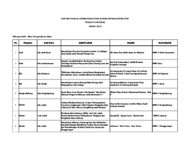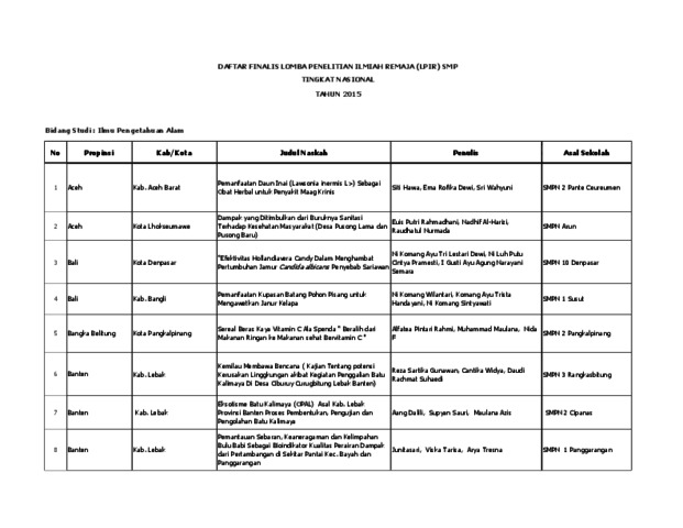 Berikut merupakan informasi mengenai daftar finalis lomba penelitian ilmiah remaja SMP tingkat nasional tahun 2015.